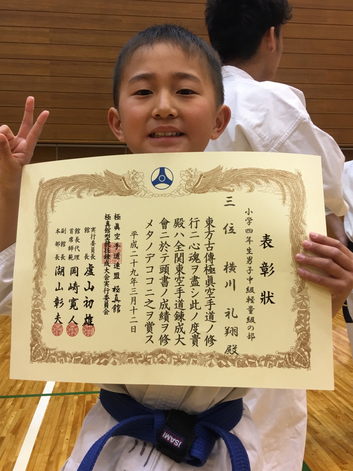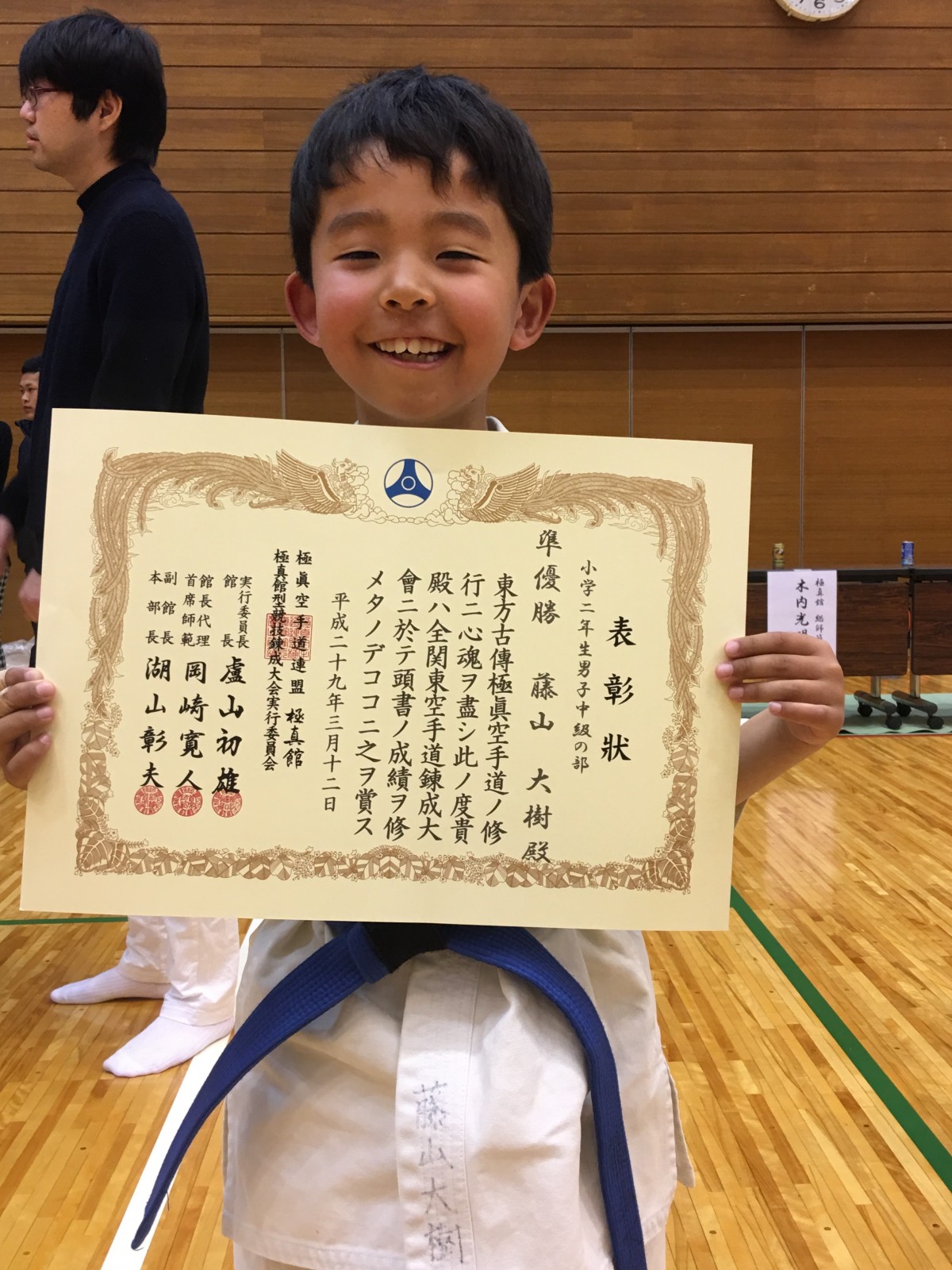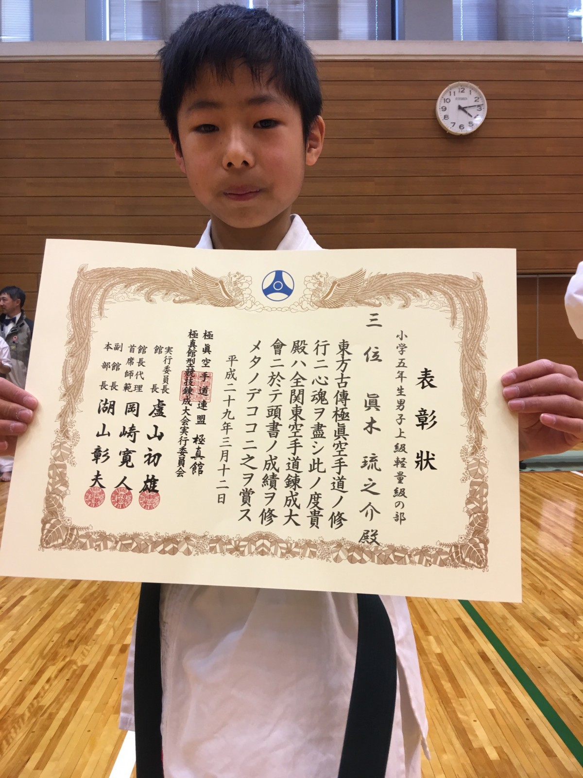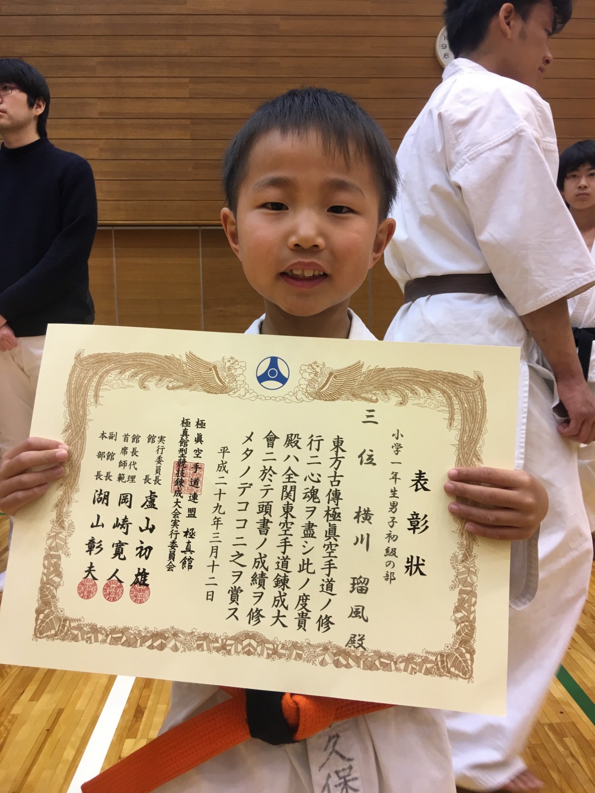 2018年12月16日(日)に川口市立戸塚スポーツセンターに於いて、第18回埼玉キューポラ杯空手道選手権が盛大に開催されました。春日部支部からは20名の選手が出場し6名の選手が入賞をすることが出来ました。特に小学1年男子上級の部に出場した古澤凛稀君は三連覇を果たすことが出来ました。また、学年を上げて中学1年男子の部に出場した眞木琉之介君は惜しくも準優勝でしたが、盧山館長よりお褒めの言葉を頂きました。また、今大会で初勝利をする選手もおりとても嬉しく思いました。